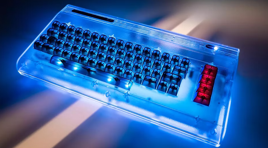 Dentro de la caja viene el propio Commodore 64 Ultimate, que está disponible en tres versiones distintas: el clásico beige, un modelo totalmente transparente con iluminación LED y una edición especial translúcida dorada reservada exclusivamente para quienes apoyaron el proyecto desde el principio.